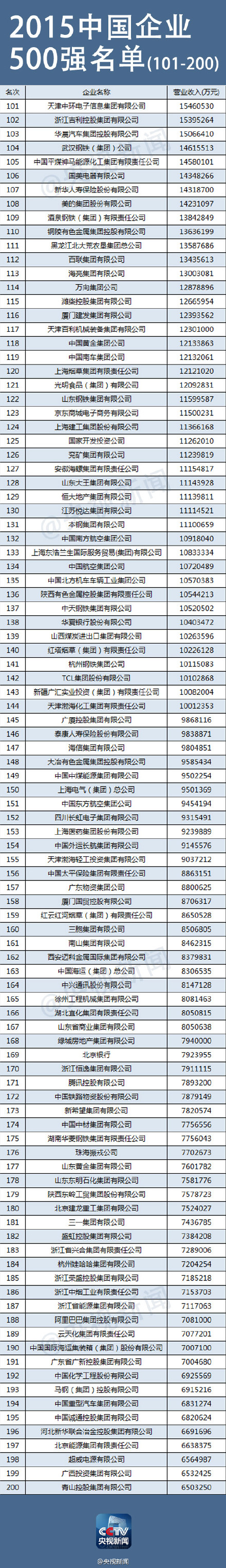 2015中國企業(yè)500強榜單部分榜單